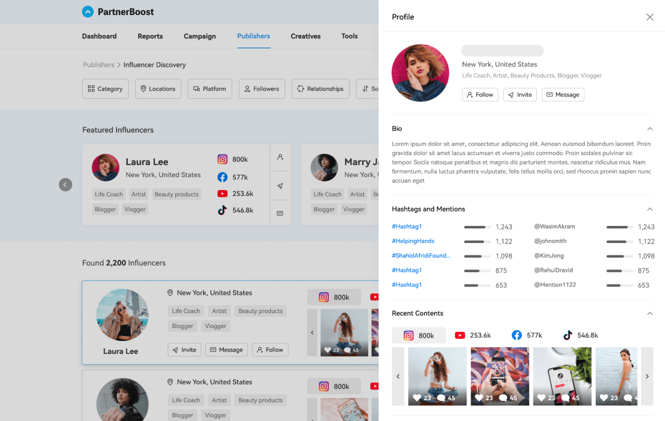 Les publics modernes font davantage confiance aux influenceurs qu'aux publicités. L'entretien des relations avec les influenceurs est devenu essentiel pour que les marques puissent étendre leur portée et gagner en popularité. Avec PartnerBoost, vous pourriez facilement trouver les influenceurs pertinents, gérer vos relations directes avec un flux de travail facile à utiliser, lancer vos campagnes d'influence, mesurer leur impact et leur performance grâce à des rapports et des analyses détaillés, et payer vos influenceurs automatiquement et avec souplesse.